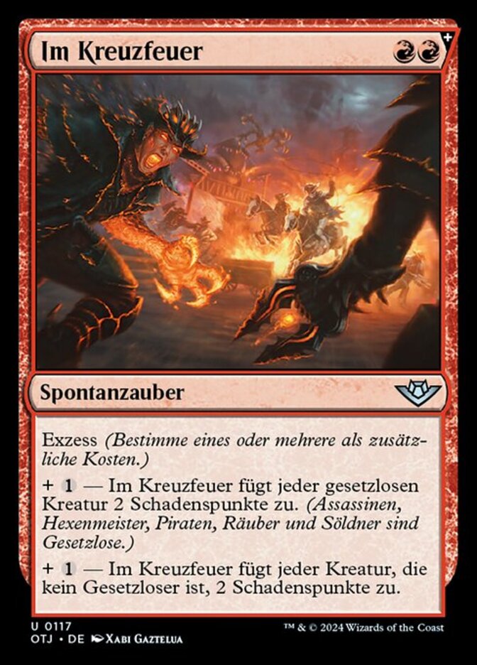 | Rules | Spree (Choose one or more additional costs.) + — Caught in the Crossfire deals 2 damage to each outlaw creature. (Assassins, Mercenaries, Pirates, Rogues, and Warlocks are outlaws.) + — Caught in the Crossfire deals 2 damage to each non-outlaw creature. |
