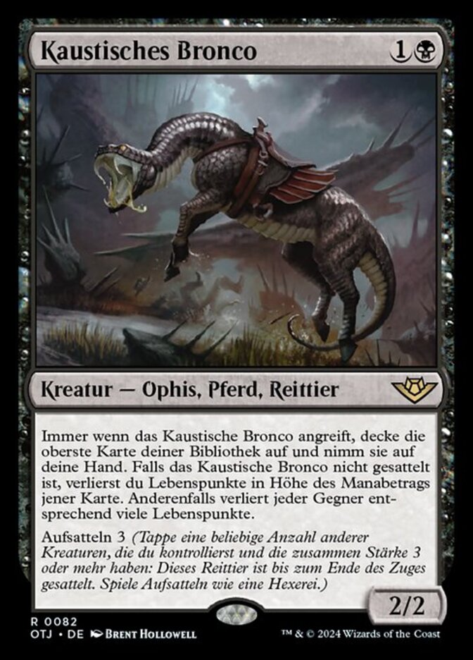 | Rules | Whenever Caustic Bronco attacks, reveal the top card of your library and put it into your hand. You lose life equal to that card's mana value if Caustic Bronco isn't saddled. Otherwise, each opponent loses that much life. Saddle 3 (Tap any number of other creatures you control with total power 3 or more: This Mount becomes saddled until end of turn. Saddle only as a sorcery.) |