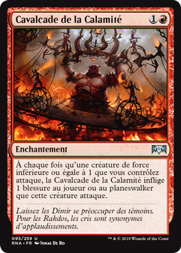 | Rules | Whenever a creature you control with power 1 or less attacks, Cavalcade of Calamity deals 1 damage to the player or planeswalker that creature is attacking. |