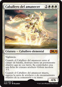 | Rules | Vigilance When Cavalier of Dawn enters the battlefield, destroy up to one target nonland permanent. Its controller creates a 3/3 colorless Golem artifact creature token. When Cavalier of Dawn dies, return target artifact or enchantment card from your graveyard to your hand. |