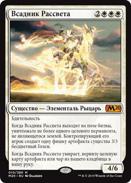 | Rules | Vigilance When Cavalier of Dawn enters the battlefield, destroy up to one target nonland permanent. Its controller creates a 3/3 colorless Golem artifact creature token. When Cavalier of Dawn dies, return target artifact or enchantment card from your graveyard to your hand. |