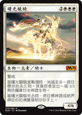 | Rules | Vigilance When Cavalier of Dawn enters the battlefield, destroy up to one target nonland permanent. Its controller creates a 3/3 colorless Golem artifact creature token. When Cavalier of Dawn dies, return target artifact or enchantment card from your graveyard to your hand. |