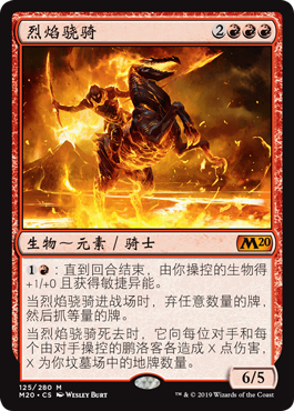 | Rules | : Creatures you control get +1/+0 and gain haste until end of turn. When Cavalier of Flame enters the battlefield, discard any number of cards, then draw that many cards. When Cavalier of Flame dies, it deals X damage to each opponent and each planeswalker they control, where X is the number of land cards in your graveyard. |