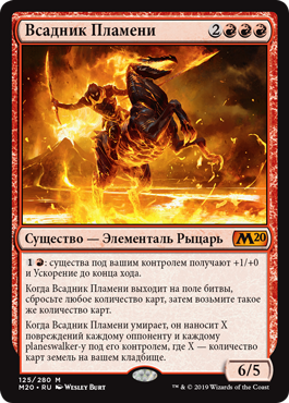 | Rules | : Creatures you control get +1/+0 and gain haste until end of turn. When Cavalier of Flame enters the battlefield, discard any number of cards, then draw that many cards. When Cavalier of Flame dies, it deals X damage to each opponent and each planeswalker they control, where X is the number of land cards in your graveyard. |