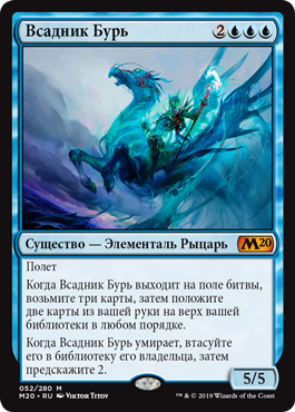 | Rules | Flying When Cavalier of Gales enters the battlefield, draw three cards, then put two cards from your hand on top of your library in any order. When Cavalier of Gales dies, shuffle it into its owner's library, then scry 2. |