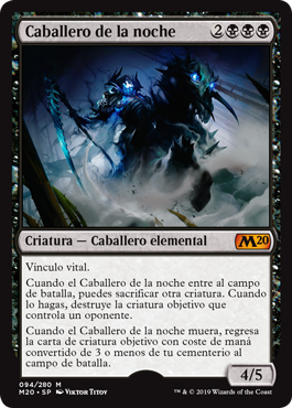 | Rules | Lifelink When Cavalier of Night enters the battlefield, you may sacrifice another creature. When you do, destroy target creature an opponent controls. When Cavalier of Night dies, return target creature card with mana value 3 or less from your graveyard to the battlefield. |