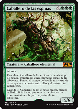 | Rules | Reach When Cavalier of Thorns enters the battlefield, reveal the top five cards of your library. Put a land card from among them onto the battlefield and the rest into your graveyard. When Cavalier of Thorns dies, you may exile it. If you do, put another target card from your graveyard on top of your library. |
