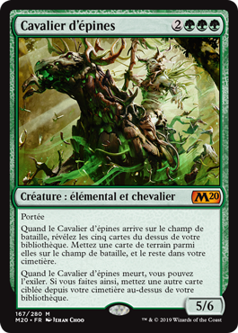 | Rules | Reach When Cavalier of Thorns enters the battlefield, reveal the top five cards of your library. Put a land card from among them onto the battlefield and the rest into your graveyard. When Cavalier of Thorns dies, you may exile it. If you do, put another target card from your graveyard on top of your library. |