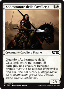 | Rules | When Cavalry Drillmaster enters the battlefield, target creature gets +2/+0 and gains first strike until end of turn. (It deals combat damage before creatures without first strike.) |