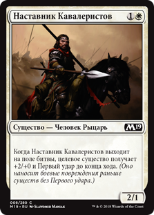 | Rules | When Cavalry Drillmaster enters the battlefield, target creature gets +2/+0 and gains first strike until end of turn. (It deals combat damage before creatures without first strike.) |