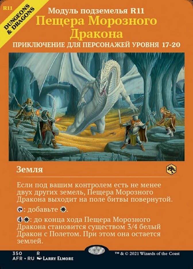 | Rules | If you control two or more other lands, Cave of the Frost Dragon enters the battlefield tapped. : Add . : Cave of the Frost Dragon becomes a 3/4 white Dragon creature with flying until end of turn. It's still a land. |