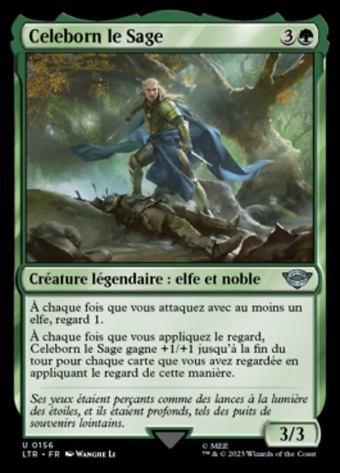 | Rules | Whenever you attack with one or more Elves, scry 1. Whenever you scry, Celeborn the Wise gets +1/+1 until end of turn for each card you looked at while scrying this way. |