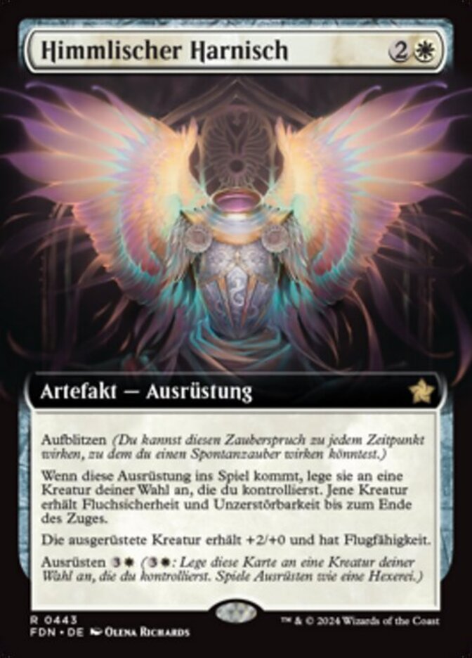 | Rules | Flash (You may cast this spell any time you could cast an instant.) When this Equipment enters, attach it to target creature you control. That creature gains hexproof and indestructible until end of turn. Equipped creature gets +2/+0 and has flying. Equip (: Attach to target creature you control. Equip only as a sorcery.) |
