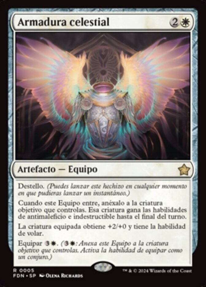 | Rules | Flash (You may cast this spell any time you could cast an instant.) When this Equipment enters, attach it to target creature you control. That creature gains hexproof and indestructible until end of turn. Equipped creature gets +2/+0 and has flying. Equip (: Attach to target creature you control. Equip only as a sorcery.) |