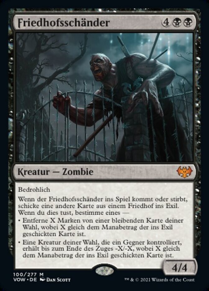 | Rules | Menace When Cemetery Desecrator enters the battlefield or dies, exile another card from a graveyard. When you do, choose one — • Remove X counters from target permanent, where X is the mana value of the exiled card. • Target creature an opponent controls gets -X/-X until end of turn, where X is the mana value of the exiled card. |