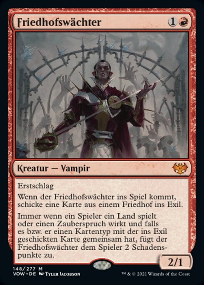 | Rules | First strike When Cemetery Gatekeeper enters the battlefield, exile a card from a graveyard. Whenever a player plays a land or casts a spell, if it shares a card type with the exiled card, Cemetery Gatekeeper deals 2 damage to that player. |