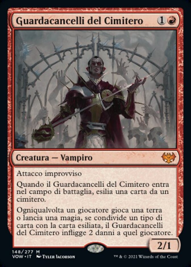 | Rules | First strike When Cemetery Gatekeeper enters the battlefield, exile a card from a graveyard. Whenever a player plays a land or casts a spell, if it shares a card type with the exiled card, Cemetery Gatekeeper deals 2 damage to that player. |