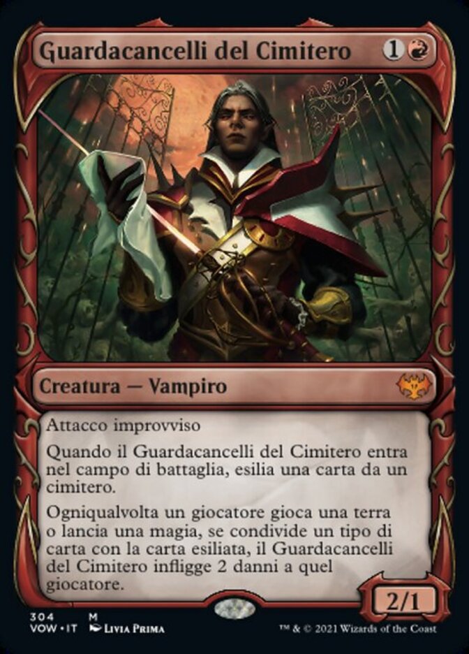 | Rules | First strike When Cemetery Gatekeeper enters the battlefield, exile a card from a graveyard. Whenever a player plays a land or casts a spell, if it shares a card type with the exiled card, Cemetery Gatekeeper deals 2 damage to that player. |