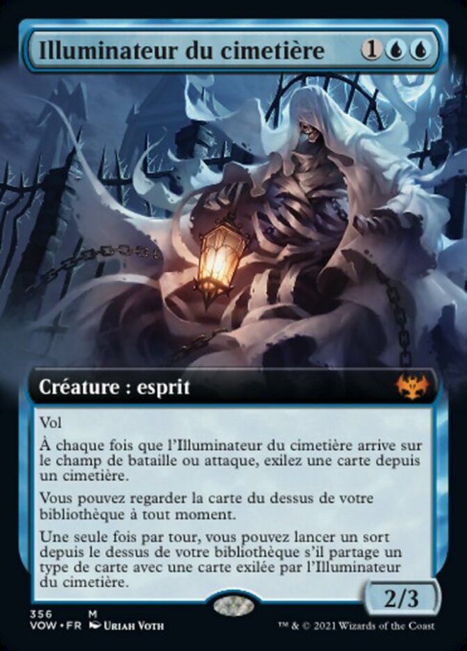 | Rules | Flying Whenever Cemetery Illuminator enters the battlefield or attacks, exile a card from a graveyard. You may look at the top card of your library any time. Once each turn, you may cast a spell from the top of your library if it shares a card type with a card exiled with Cemetery Illuminator. |
