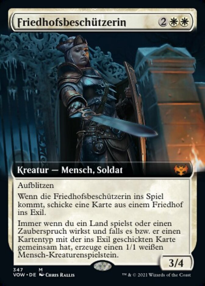 | Rules | Flash When Cemetery Protector enters the battlefield, exile a card from a graveyard. Whenever you play a land or cast a spell, if it shares a card type with the exiled card, create a 1/1 white Human creature token. |