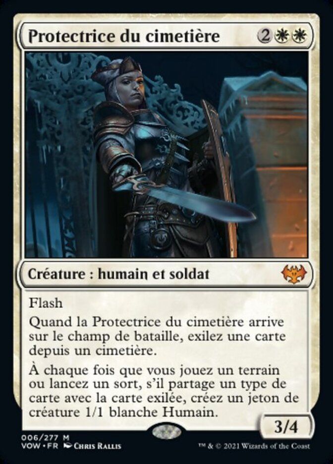 | Rules | Flash When Cemetery Protector enters the battlefield, exile a card from a graveyard. Whenever you play a land or cast a spell, if it shares a card type with the exiled card, create a 1/1 white Human creature token. |