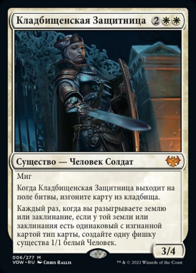 | Rules | Flash When Cemetery Protector enters the battlefield, exile a card from a graveyard. Whenever you play a land or cast a spell, if it shares a card type with the exiled card, create a 1/1 white Human creature token. |