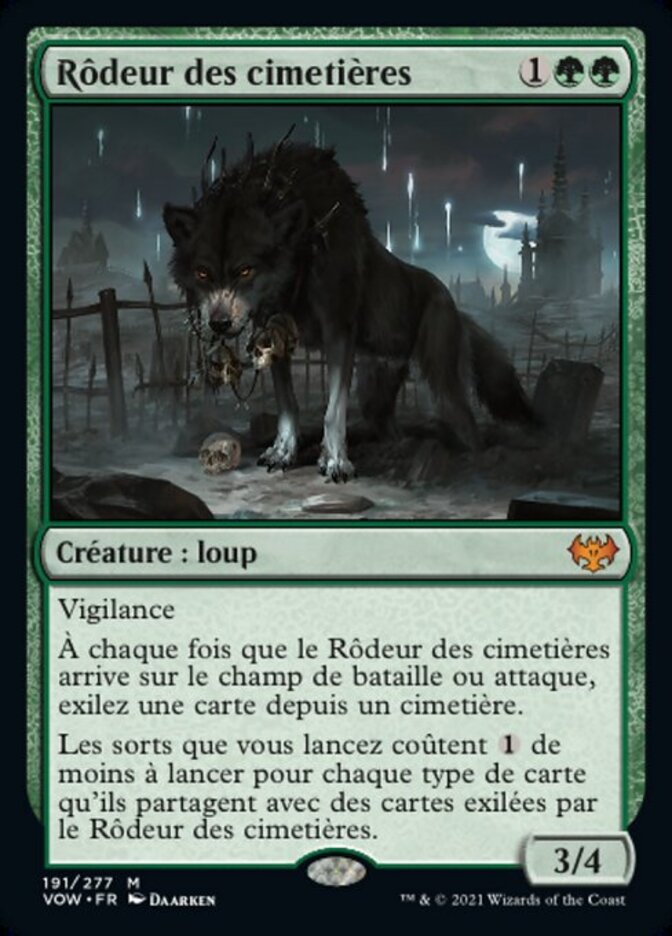 | Rules | Vigilance Whenever Cemetery Prowler enters the battlefield or attacks, exile a card from a graveyard. Spells you cast cost less to cast for each card type they share with cards exiled with Cemetery Prowler. |