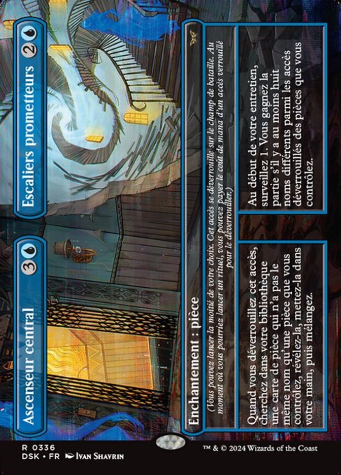 | Rules | (You may cast either half. That door unlocks on the battlefield. As a sorcery, you may pay the mana cost of a locked door to unlock it.) When you unlock this door, search your library for a Room card that doesn't have the same name as a Room you control, reveal it, put it into your hand, then shuffle. // (You may cast either half. That door unlocks on the battlefield. As a sorcery, you may pay the mana cost of a locked door to unlock it.) At the beginning of your upkeep, surveil 1. You win the game if there are eight or more different names among unlocked doors of Rooms you control. |