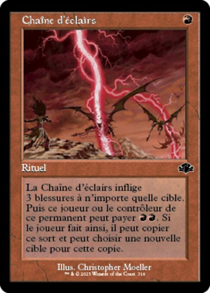 | Rules | Chain Lightning deals 3 damage to any target. Then that player or that permanent's controller may pay . If the player does, they may copy this spell and may choose a new target for that copy. |