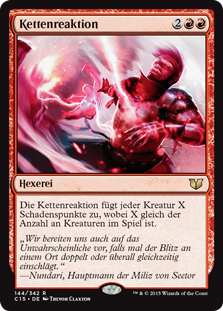 | Rules | Chain Reaction deals X damage to each creature, where X is the number of creatures on the battlefield. |
