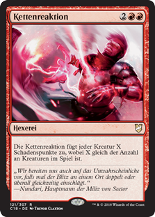| Rules | Chain Reaction deals X damage to each creature, where X is the number of creatures on the battlefield. |