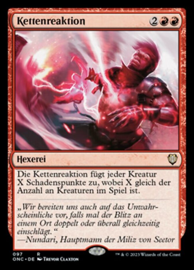| Rules | Chain Reaction deals X damage to each creature, where X is the number of creatures on the battlefield. |