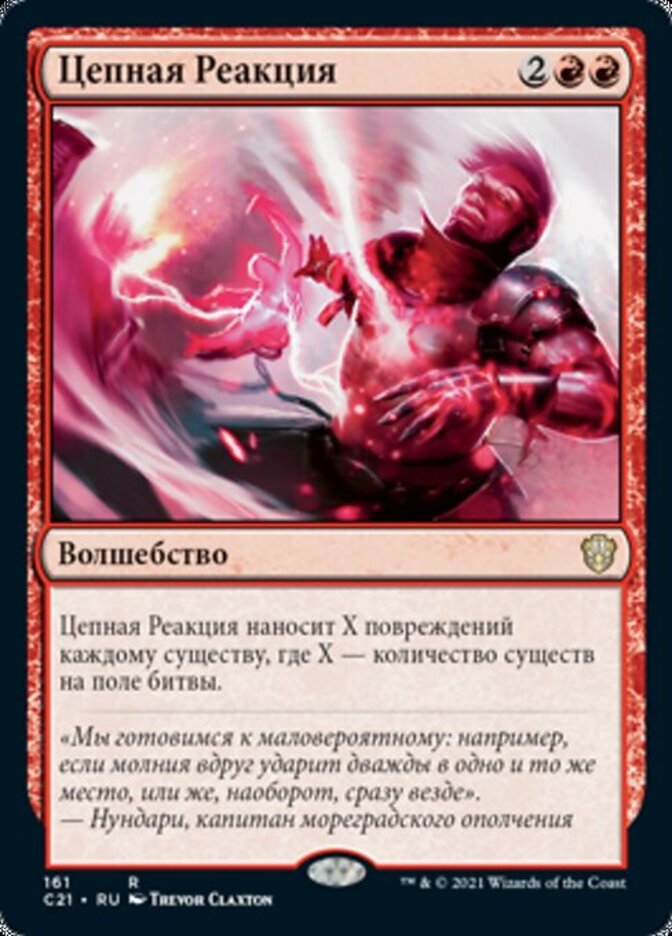 | Rules | Chain Reaction deals X damage to each creature, where X is the number of creatures on the battlefield. |