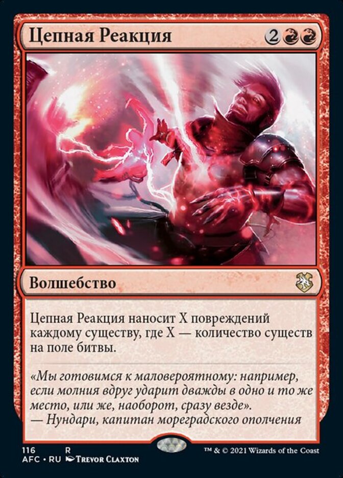 | Rules | Chain Reaction deals X damage to each creature, where X is the number of creatures on the battlefield. |