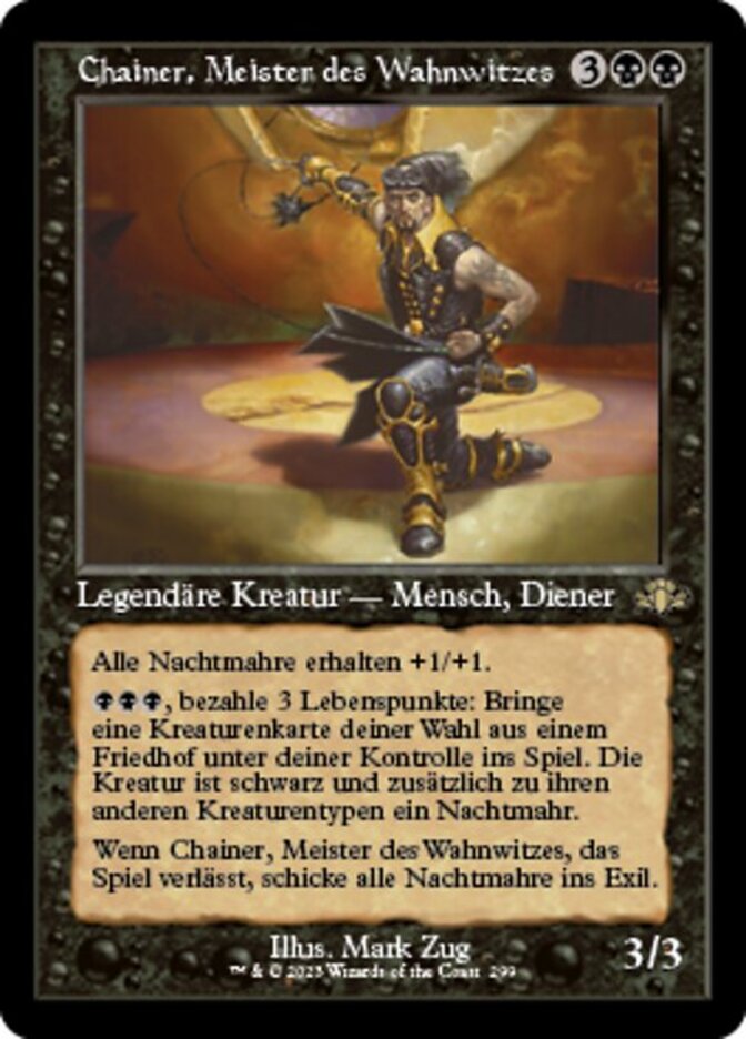 | Rules | Nightmare creatures get +1/+1. , Pay 3 life: Put target creature card from a graveyard onto the battlefield under your control. That creature is black and is a Nightmare in addition to its other creature types. When Chainer, Dementia Master leaves the battlefield, exile all Nightmares. |