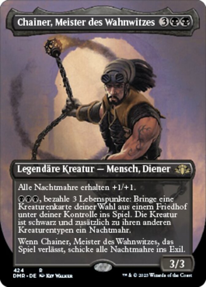 | Rules | Nightmare creatures get +1/+1. , Pay 3 life: Put target creature card from a graveyard onto the battlefield under your control. That creature is black and is a Nightmare in addition to its other creature types. When Chainer, Dementia Master leaves the battlefield, exile all Nightmares. |