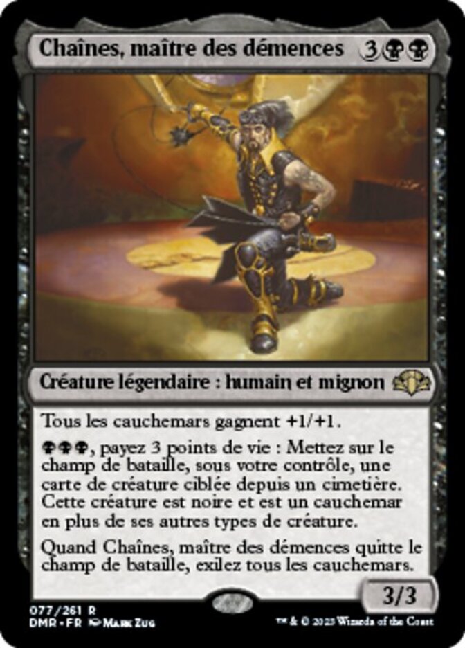 | Rules | Nightmare creatures get +1/+1. , Pay 3 life: Put target creature card from a graveyard onto the battlefield under your control. That creature is black and is a Nightmare in addition to its other creature types. When Chainer, Dementia Master leaves the battlefield, exile all Nightmares. |