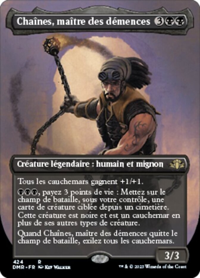 | Rules | Nightmare creatures get +1/+1. , Pay 3 life: Put target creature card from a graveyard onto the battlefield under your control. That creature is black and is a Nightmare in addition to its other creature types. When Chainer, Dementia Master leaves the battlefield, exile all Nightmares. |