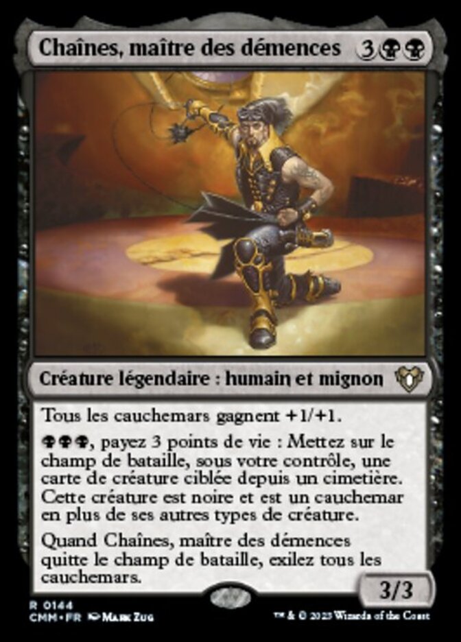 | Rules | Nightmare creatures get +1/+1. , Pay 3 life: Put target creature card from a graveyard onto the battlefield under your control. That creature is black and is a Nightmare in addition to its other creature types. When Chainer, Dementia Master leaves the battlefield, exile all Nightmares. |