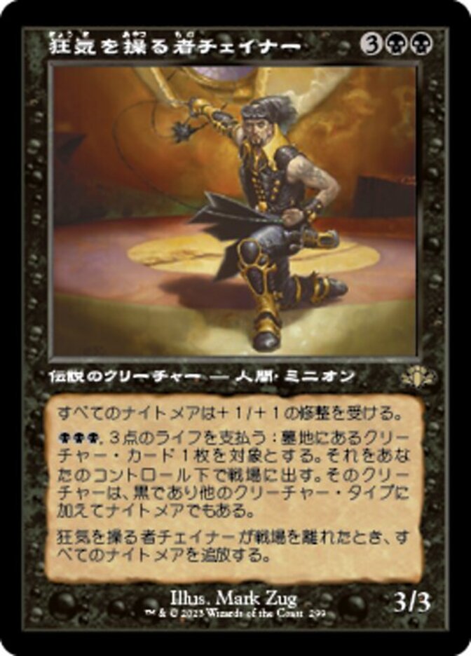 | Rules | Nightmare creatures get +1/+1. , Pay 3 life: Put target creature card from a graveyard onto the battlefield under your control. That creature is black and is a Nightmare in addition to its other creature types. When Chainer, Dementia Master leaves the battlefield, exile all Nightmares. |