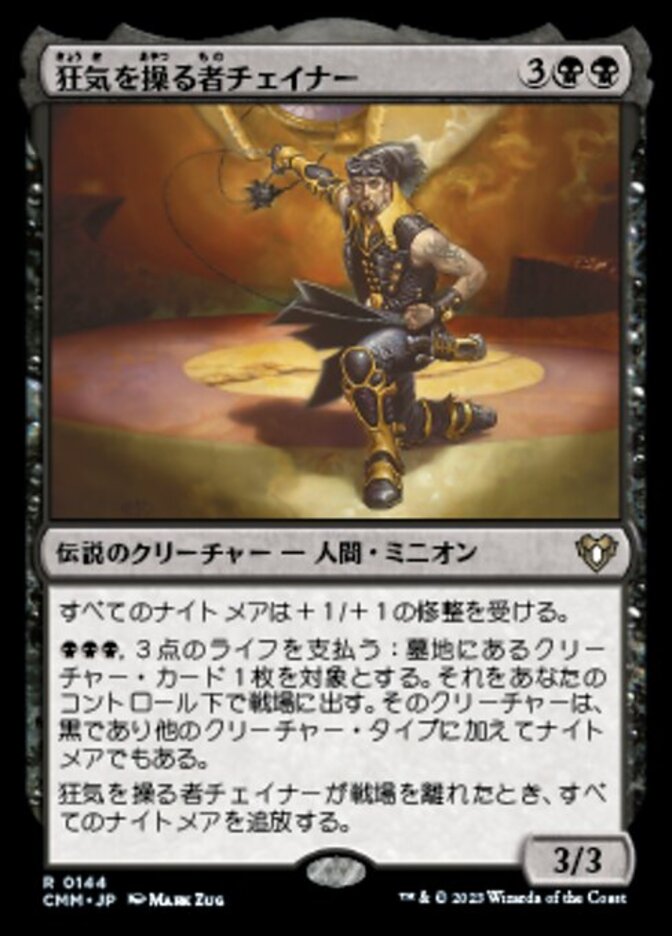 | Rules | Nightmare creatures get +1/+1. , Pay 3 life: Put target creature card from a graveyard onto the battlefield under your control. That creature is black and is a Nightmare in addition to its other creature types. When Chainer, Dementia Master leaves the battlefield, exile all Nightmares. |