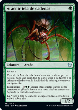 | Rules | Reach When Chainweb Aracnir enters the battlefield, it deals damage equal to its power to target creature with flying an opponent controls. Escape—, Exile four other cards from your graveyard. (You may cast this card from your graveyard for its escape cost.) Chainweb Aracnir escapes with three +1/+1 counters on it. |