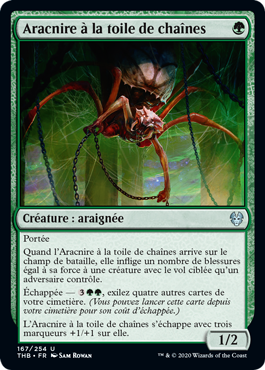 | Rules | Reach When Chainweb Aracnir enters the battlefield, it deals damage equal to its power to target creature with flying an opponent controls. Escape—, Exile four other cards from your graveyard. (You may cast this card from your graveyard for its escape cost.) Chainweb Aracnir escapes with three +1/+1 counters on it. |
