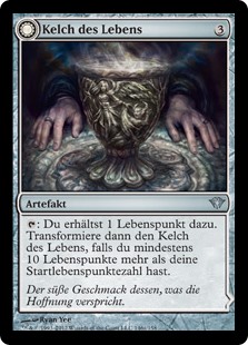 | Rules | : You gain 1 life. Then if you have at least 10 life more than your starting life total, transform Chalice of Life. // : Target player loses 5 life. |
