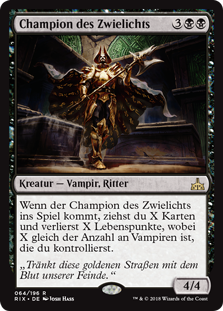 | Rules | When Champion of Dusk enters the battlefield, you draw X cards and you lose X life, where X is the number of Vampires you control. |