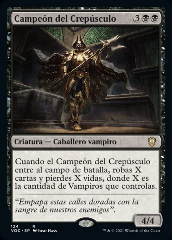 | Rules | When Champion of Dusk enters the battlefield, you draw X cards and you lose X life, where X is the number of Vampires you control. |