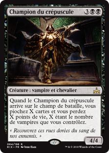 | Rules | When Champion of Dusk enters the battlefield, you draw X cards and you lose X life, where X is the number of Vampires you control. |