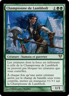 | Rules | Creatures with power less than Champion of Lambholt's power can't block creatures you control. Whenever another creature enters the battlefield under your control, put a +1/+1 counter on Champion of Lambholt. |