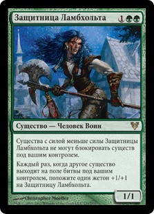 | Rules | Creatures with power less than Champion of Lambholt's power can't block creatures you control. Whenever another creature enters the battlefield under your control, put a +1/+1 counter on Champion of Lambholt. |