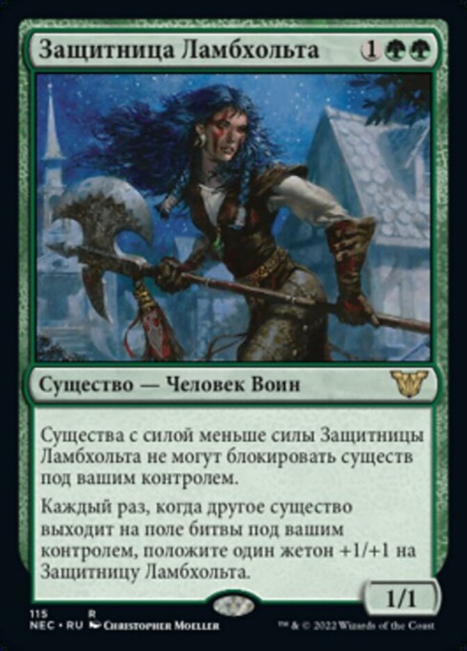 | Rules | Creatures with power less than Champion of Lambholt's power can't block creatures you control. Whenever another creature enters the battlefield under your control, put a +1/+1 counter on Champion of Lambholt. |